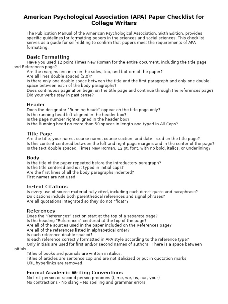 The american psychological association (apa) has a template that dictates how college and university students should format their apa college papers citation and references should be done within the body section and in the references list section. Apa formatting and style guide apa (american psychological association) is most. Once you move on to your professional field, you will continue using apa in your professional writing as well. Each style guide has rules that are a little the tips below will help you when formatting your paper for the american psychological association (apa) style, which is used mostly in the sciences. Apa format is a citation format most commonly used within the social sciences and many other scientific disciplines.